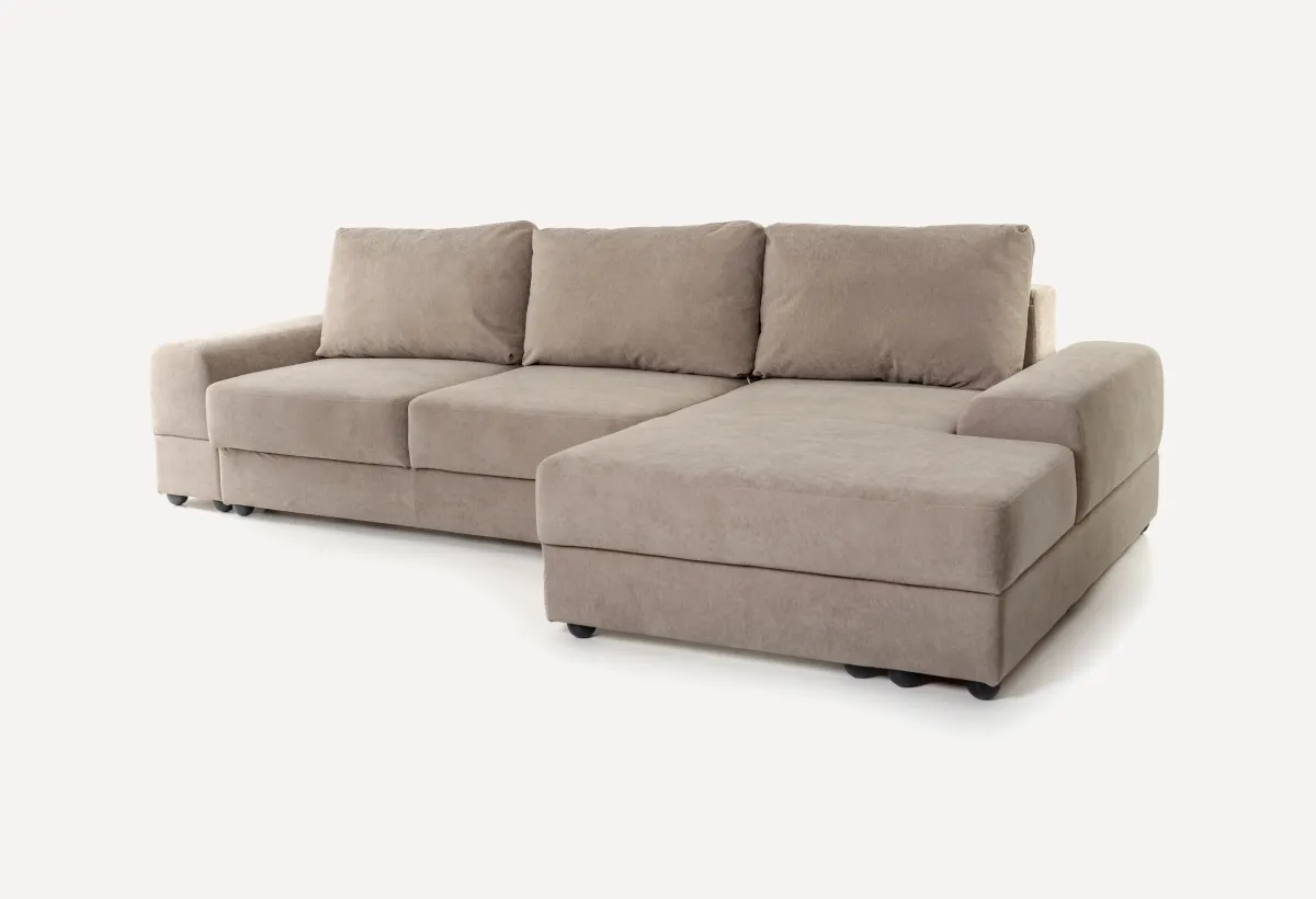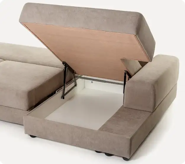 То же, что и средний диван, но с подлокотником с одной стороны. Внутри — механизм трансформации пантограф и ящик для белья. Можно использовать как отдельный диван для маленькой комнаты или как крайний модуль в большой конструкции.