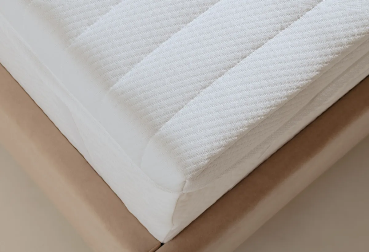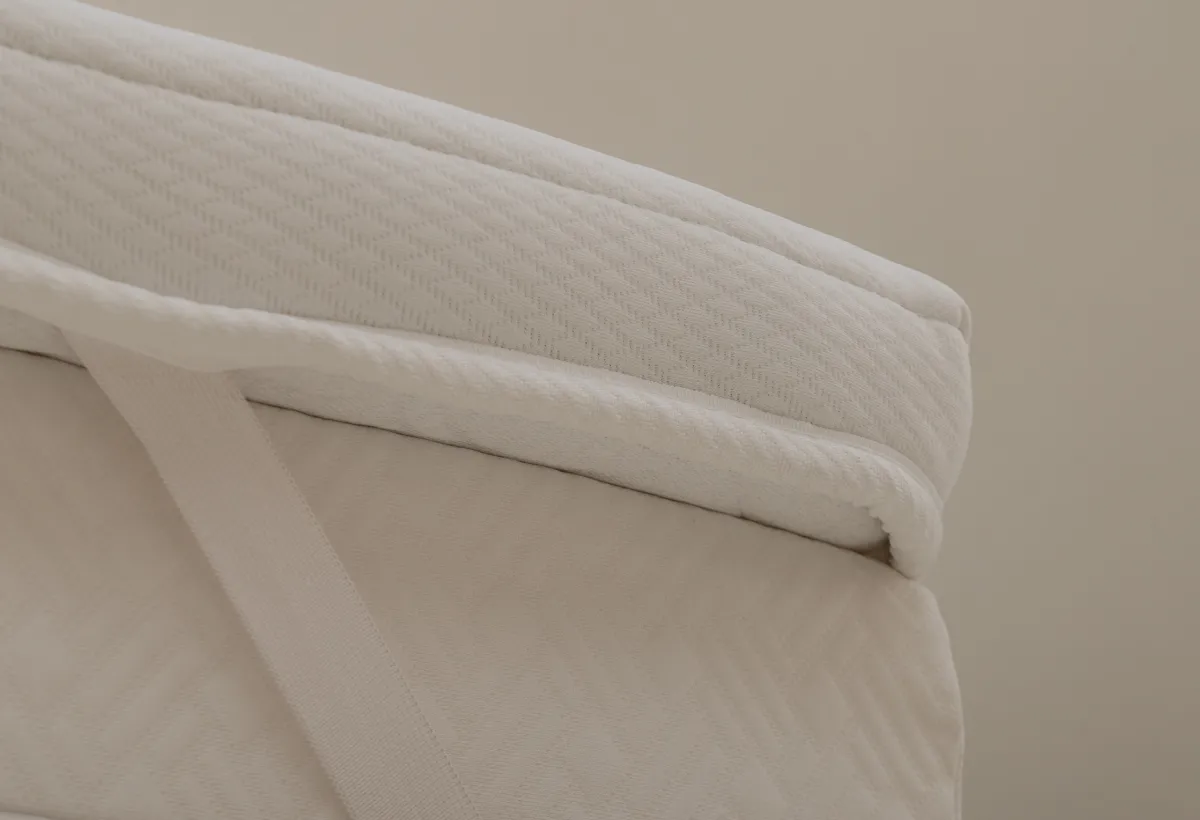 Этот топпер создан, чтобы помочь вам по-настоящему расслабиться. Он не жёсткий, а упругий и отзывчивый — тело на нём не проваливается, а мягко поддерживается. Всё дело в двух слоях пены. Нижний, 2 см, — это плотная основа для поддержки. Верхний, 3 см, — пена с рельефной поверхностью. Она создаёт лёгкий массажный эффект, который помогает снять напряжение после долгого дня. Это не интенсивный массаж, а скорее приятное покалывание для расслабления. Вместе они создают комфортную среднюю жёсткость. А стёганый чехол сверху делает поверхность приятной на ощупь.